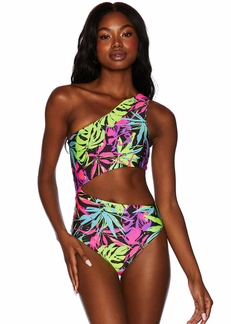 Beach Riot’s Celine One Piece is their best selling asymmetrical one piece swimsuit now featured in Neon Palms. This one piece features a side cutout and moderate coverage.
