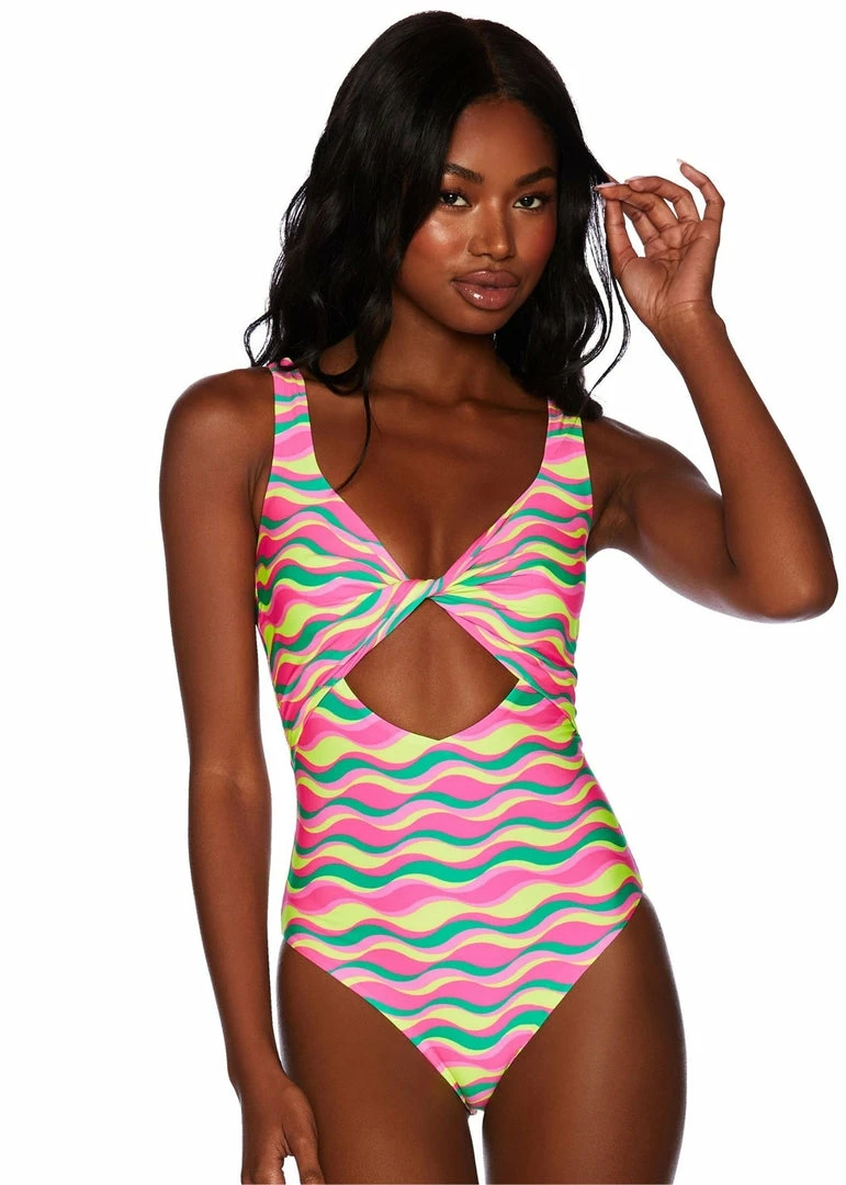 The Tyler One Piece is Beach Riots newest one piece silhouette with moderate coverage and a cut out detail in the front keeping you covered but flirty. The 90s wave print is bright, bold and beautiful just like you.