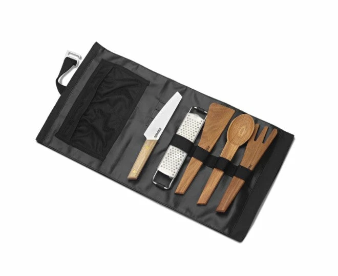 - Includes a knife, grater, and wooden cooking spoons and utensils conveniently rolled in a durable wrap