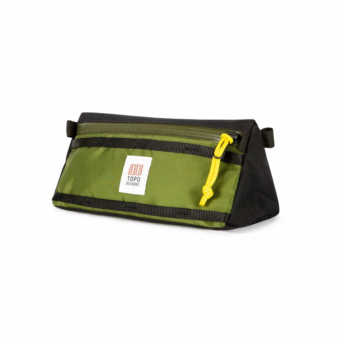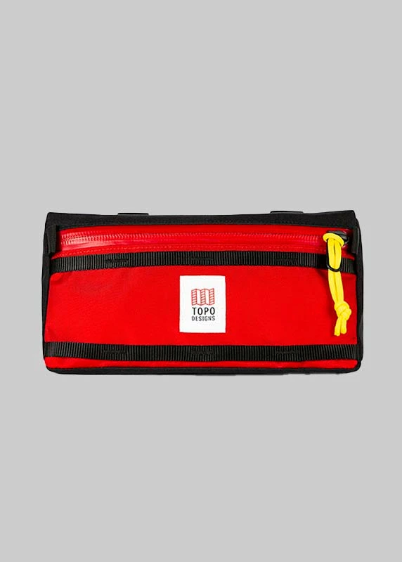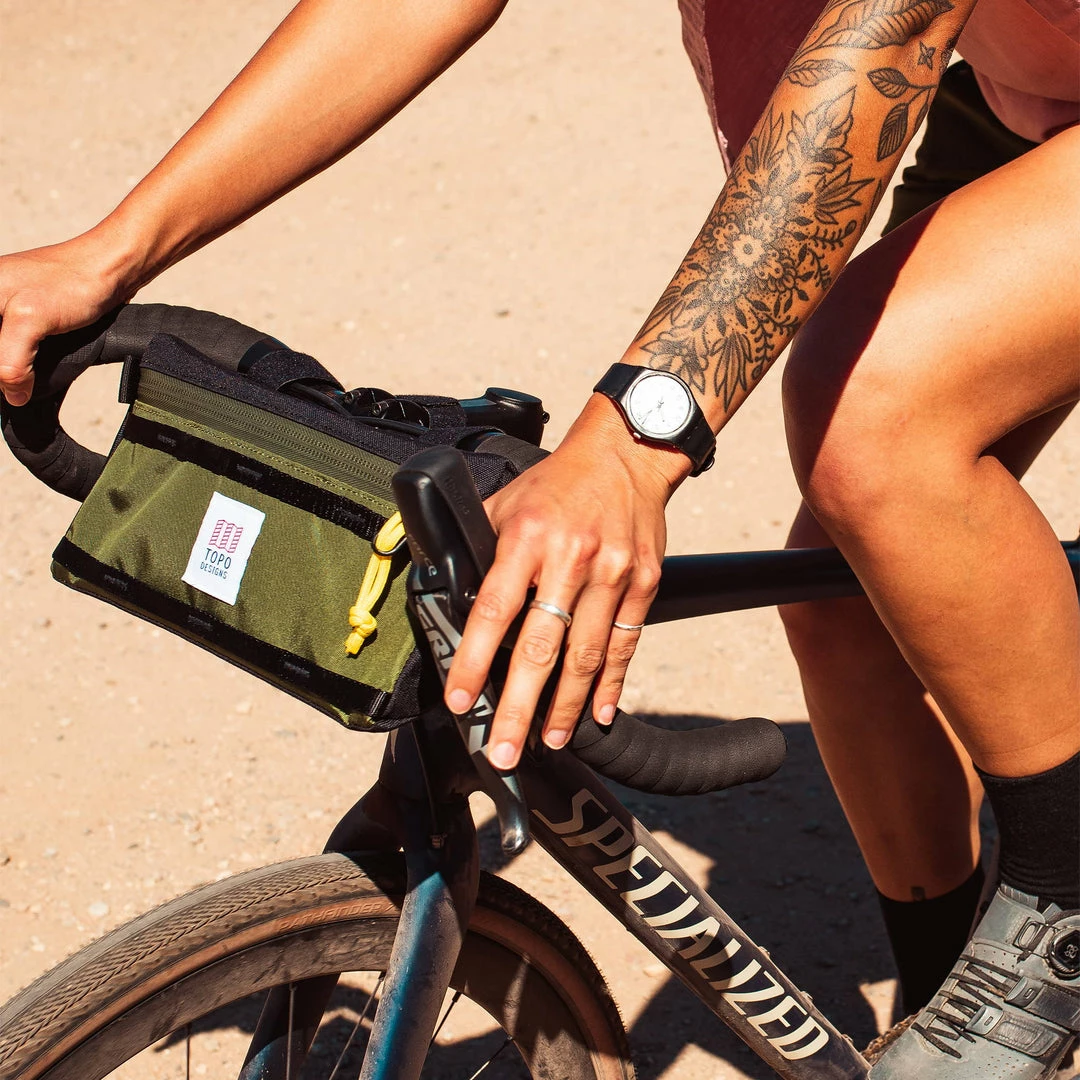 Topo’s Bike Bag provides a place to stash everything from tools and tubes to an extra layer or a snack. Versatile enough to attach to the front bars of most bikes, the Bike Bag has daisy chain webbing to easily clip a bike light. Pops off bike easily and has a removable shoulder strap for off-bike use